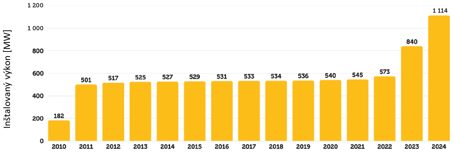 Sektor fotovoltiky na Slovensku preukazuje výraznú dynamiku, ktorá je v súlade s celoeurópskym trendom posilňovania obnoviteľných zdrojov energie. Analýza dát z konca roka 2024 potvrdzuje tento trend a ukazuje, že rast sa stále zrýchľuje. Celkový prírastok novej kapacity v roku 2024 dosiahol 274 MW, čo predstavuje druhú najvyššiu ročnú hodnotu od referenčného roku 2010. Vďaka tejto akcelerácii dosiahol kumulatívny inštalovaný výkon fotovoltických (FV) systémov na Slovensku ku koncu roka 1 114 MW [1].