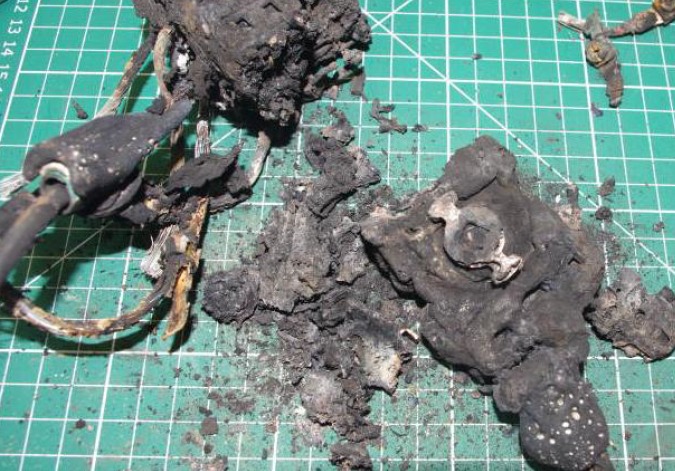 Obrázok 12 Zvyšky DC invertora pri rozoberaní a skúmaní v laboratóriu [9]