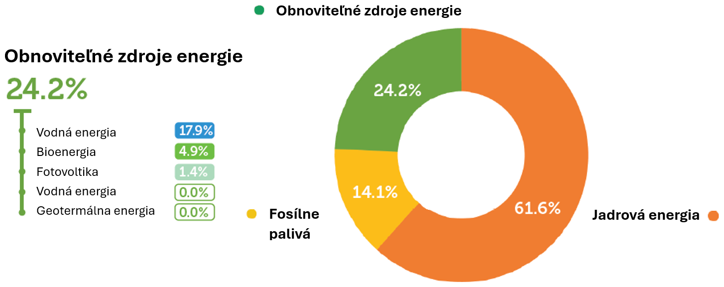Obrázok 2 Podiel jednotlivých zdrojov na celkovej výrobe elektriny na Slovensku (2024): obnoviteľné zdroje energie (zelená), jadrová energia (oranžová), fosílne palivá (žltá)) [1]