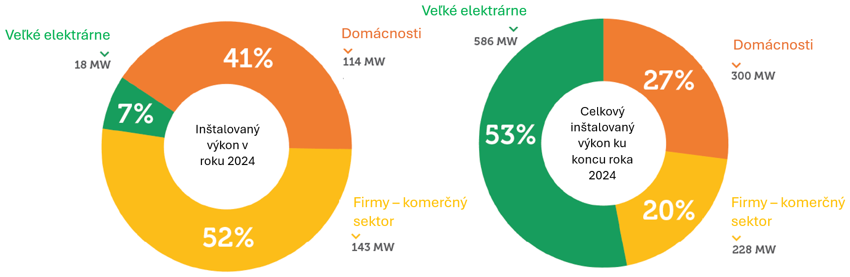 Obrázok 3 Inštalovaný výkon a počet fotovoltických elektrární na Slovensku podľa typu (2024). Prírastok inštalovaného výkonu podľa segmentov nainštalované v roku 2024 (vľavo), celkovo nainštalované do roku 2024 (vpravo): veľké elektrárne (zelená), domácnosti (oranžová), firmy – komerčný sektor (žltá) [1].