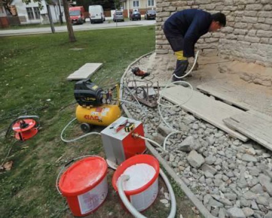 Obr. 6 a 7. Vľavo je stroj režúci murivo s pomocou „diamantového“ lana a vpravo injektážna súprava v akcii