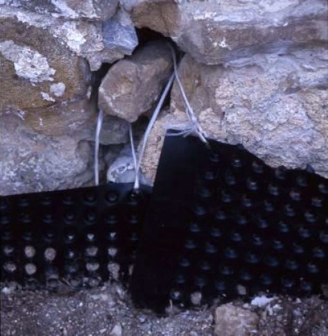 Obr. 4. Príklad málo účinnej technológie v prípadoch vysokej hodnoty zamokrenia muriva. Fólia nie je ani riadne zakončená a chránená pred zatekaním dažďovou vodou.