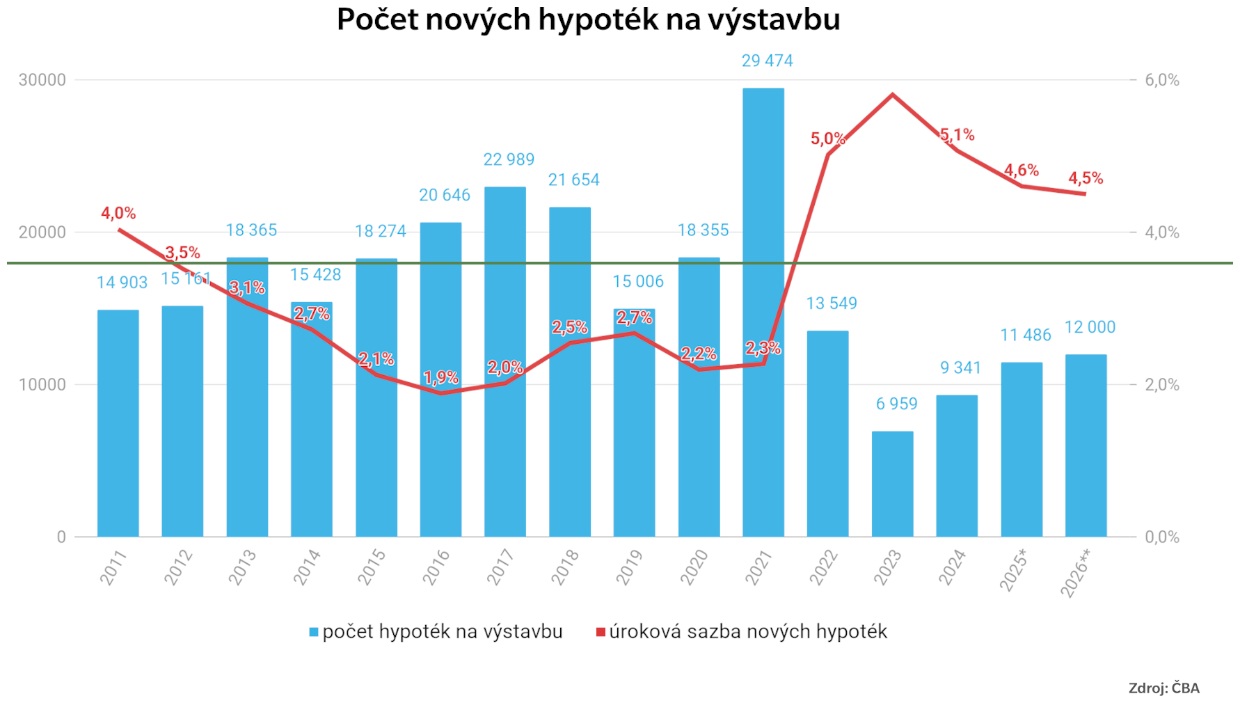 Výstavba nových bytů i rodinných domů zaostává za skutečnými potřebami obyvatel, trh dále nabírá ztrátu a očekávané probuzení stále nepřichází. Počet nových hypoték určených na výstavbu rodinných domů v roce 2025 dosáhl pouhých 11,5 tisíce a zůstal tak o 40 % pod dlouhodobým průměrem.