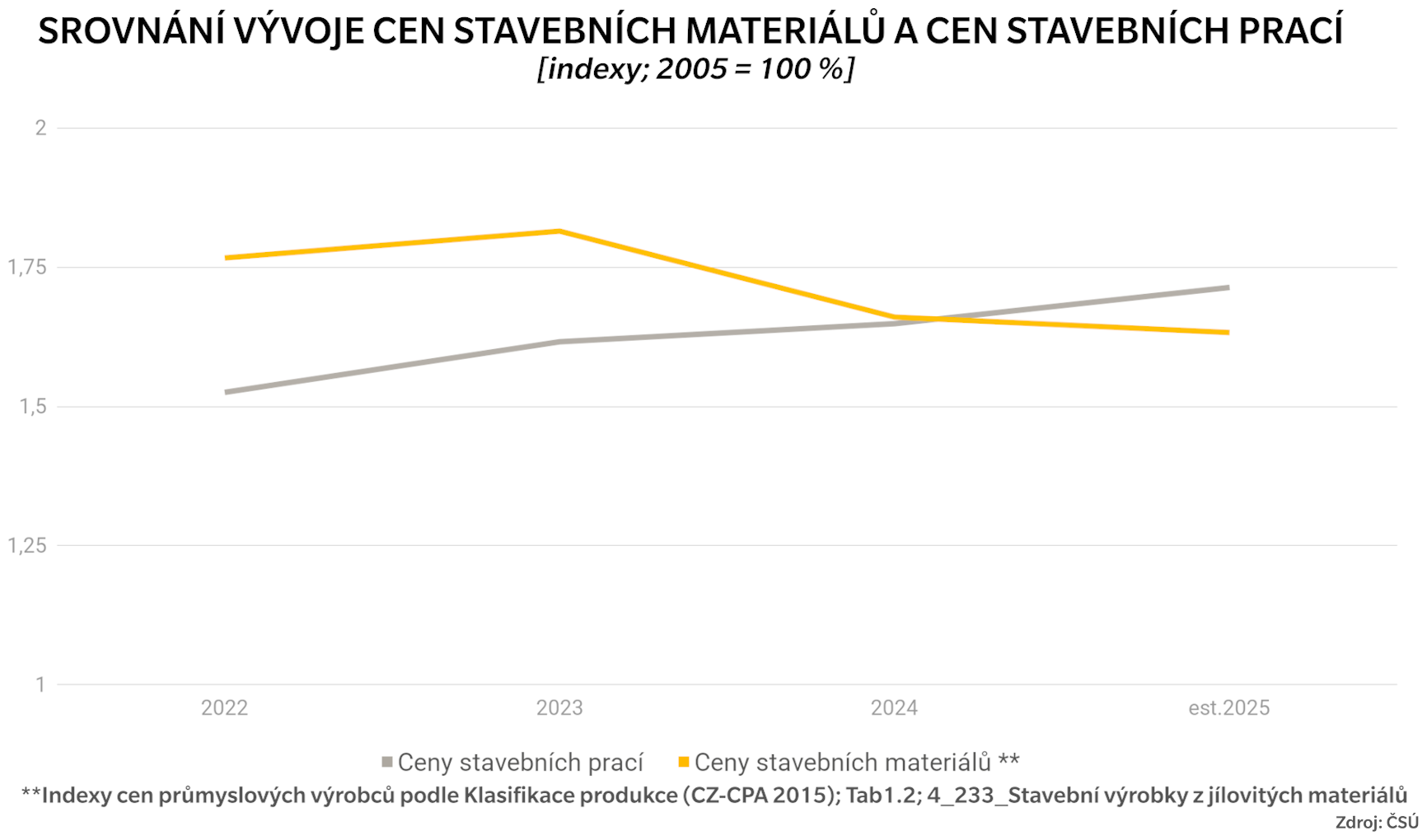 Graf znázorňuje srovnání vývoje cen stavebních materiálů a cen stavebních prací.