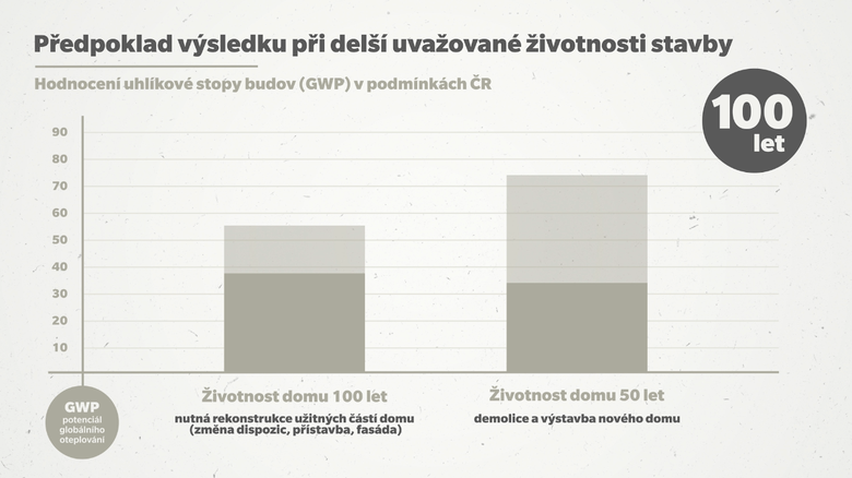 Cílem studie bylo porovnat environmentální dopady různých typů konstrukčních řešení v celém jejich životním cyklu, tedy od vzniku až po likvidaci – „from cradle to grave” v horizontu 50 let. Pouze na základě takto komplexního přístupu je možné vytvořit podklad pro kvalifikované rozhodování. Výsledky ukazují, že rozdíly mezi jednotlivými konstrukčními variantami jsou minimální. Rozdíl v globálním oteplovacím potenciálu (GWP) mezi cihelnou, pórobetonovou a sendvičovou stěnou činí pouhých 2,72 kg CO2 na m2 za rok. Za období 50 let to odpovídá emisím, které vzniknou při cestě automobilem z Prahy do Brna a zpět.