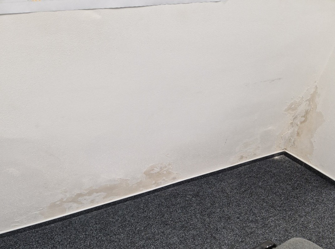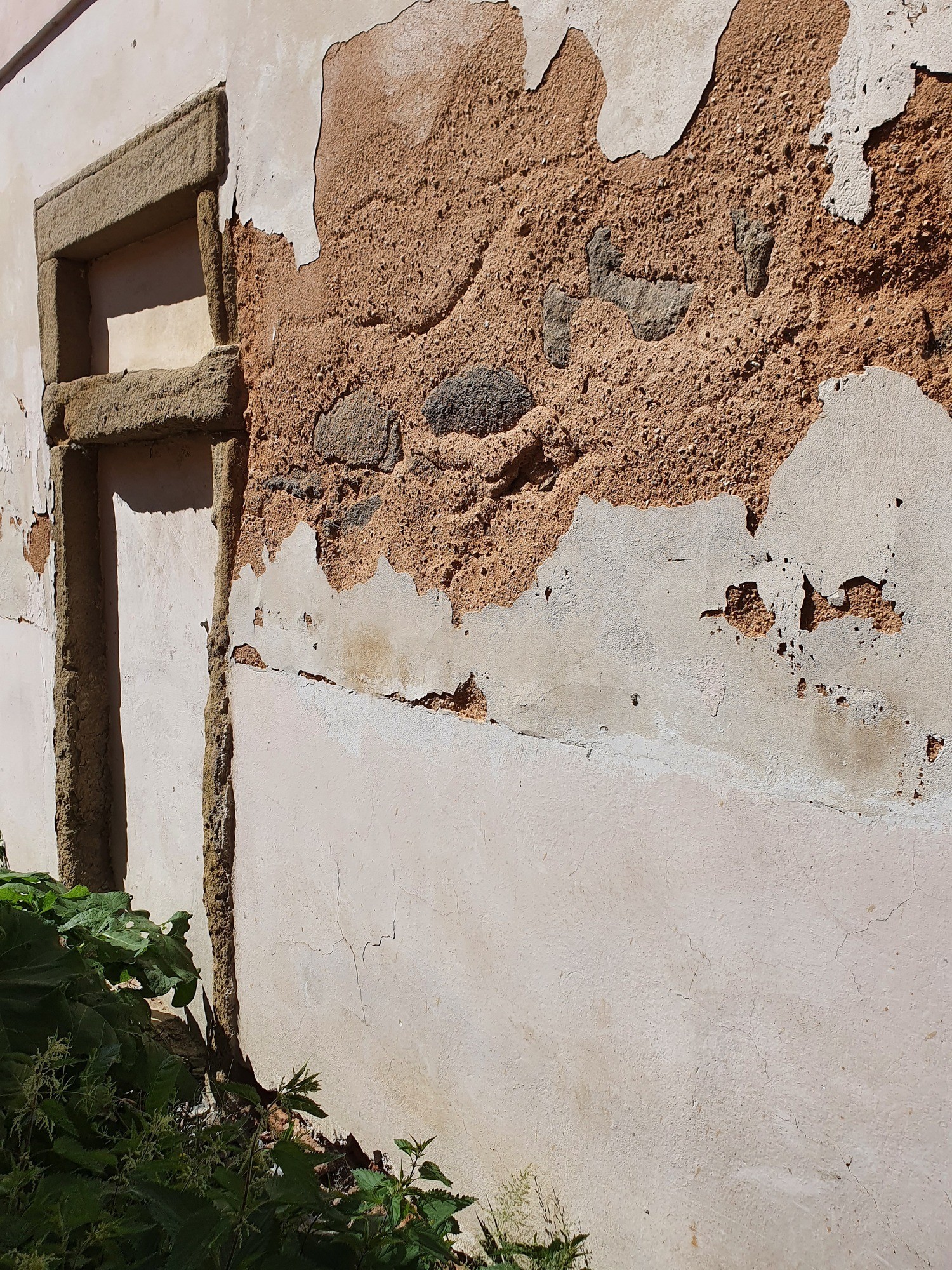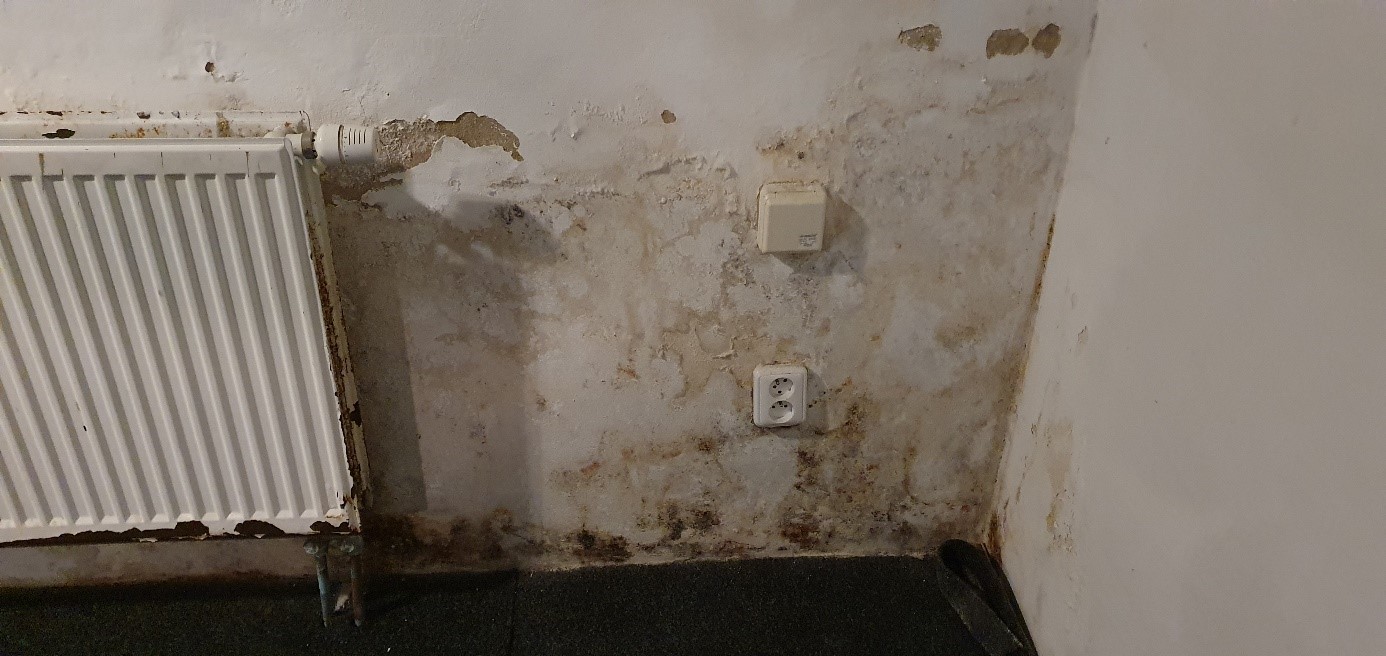 Obr. 5: Pohled na neizolovanou zeď s vážným poškozením. Vpravo zdivo s přizdívkou, bez viditelného poškození.