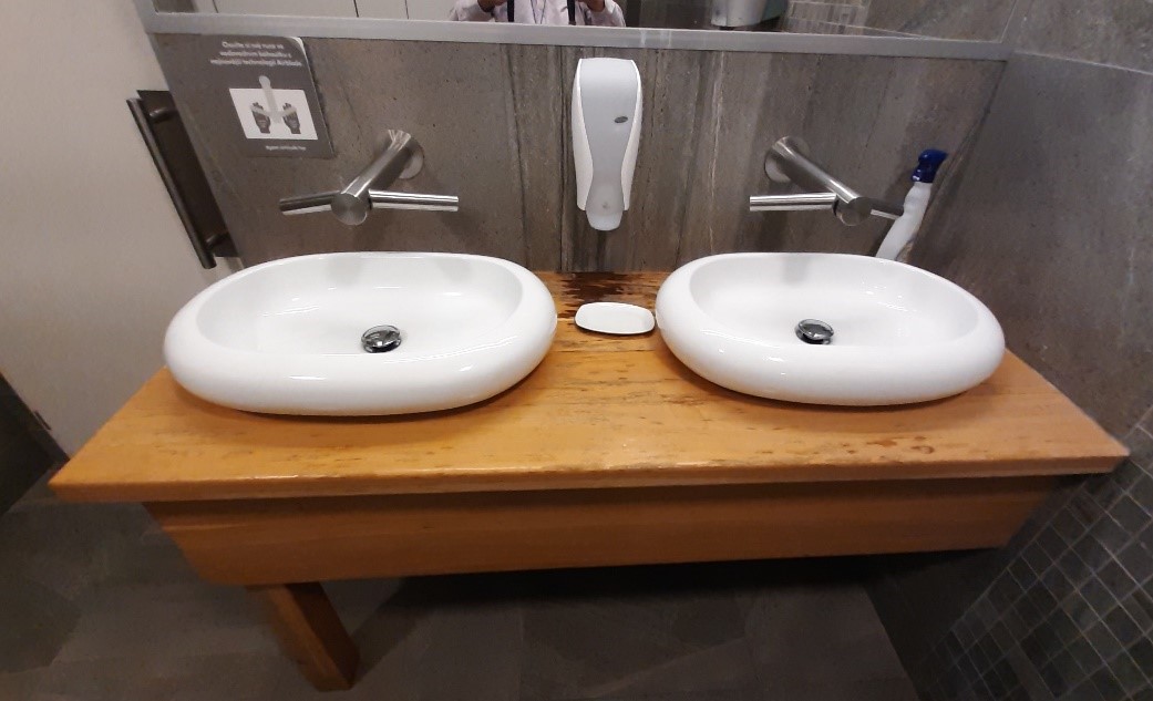 Dnešní návrhy občas obsahují řešení s dřevěnou deskou a umyvadlem položeným na ní (obr. 1, 2). Dřevo a voda není z hlediska estetiky nejlepší řešení, kromě prvních několika týdnů používání hygienických místností. Na obr. 2 je detail desky po dvou letech provozu. Vzhled hygienických místností při pravidelné údržbě nemá vliv na funkci zařízení. Pokud se začne údržba zanedbávat, začnou se problémy s kvalitou povrchu prohlubovat a důsledkem bývá i změna chování uživatelů k horšímu.