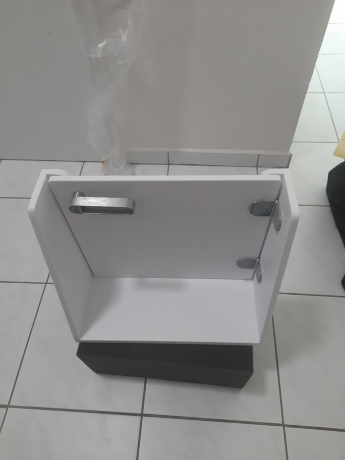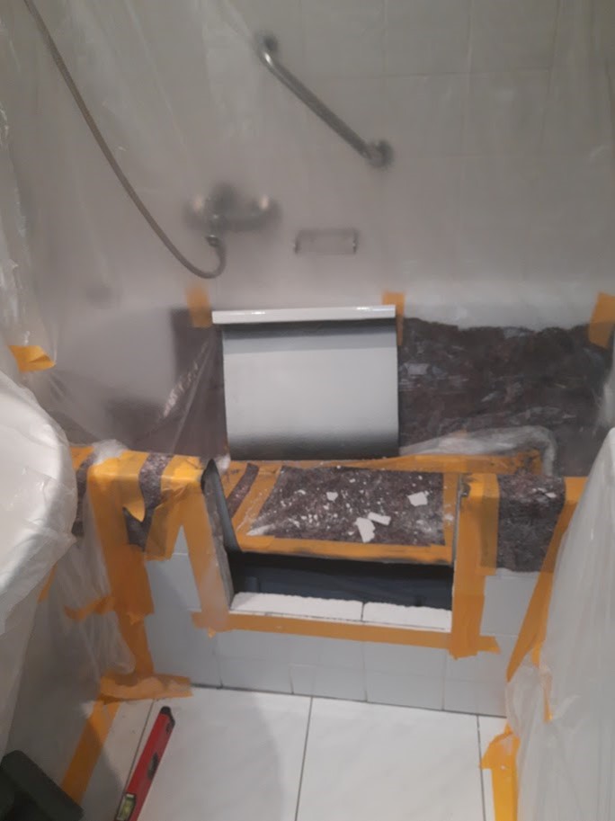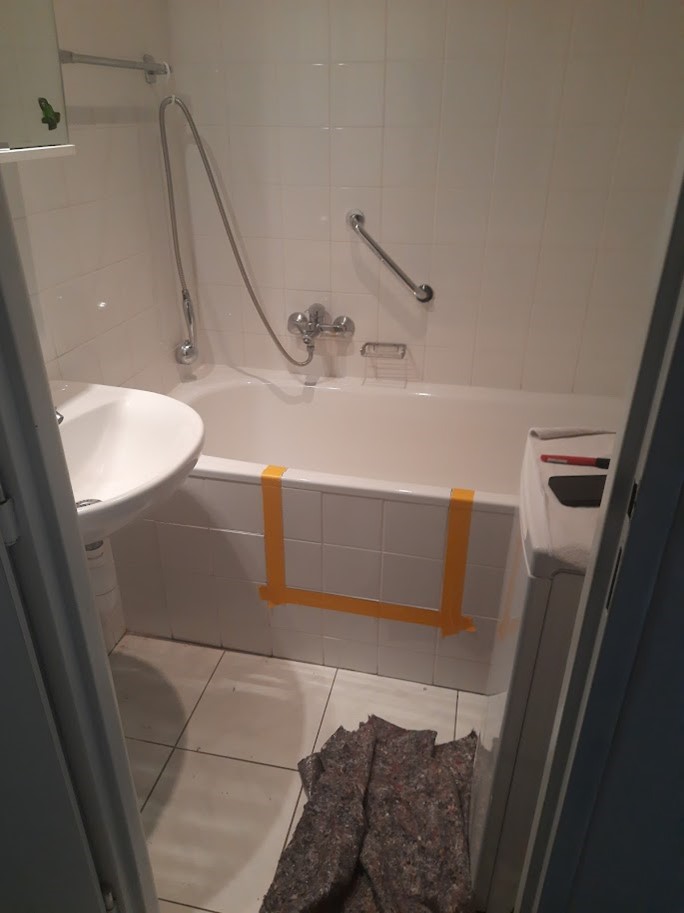 Nejmenší a nejkratší zásah do provozu bytu je využitím netradičního řešení osazením vstupních dvířek do stávající vany (obr. 5). Firma si provede zaměření stávajícího stavu a na jeho základě si vyrobí dvířka, která následně osadí do tělesa vany. Vlastní montáž spočívá v zakrytí stěn a zařízení koupelny. Během práce se nemusí vymístit žádné ze stávajících zařízení (např. pračka). Následně se provede vymezení budoucího otvoru do stěny vany (obr. 6).