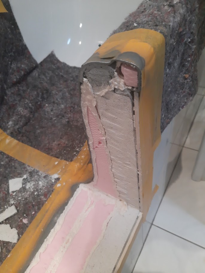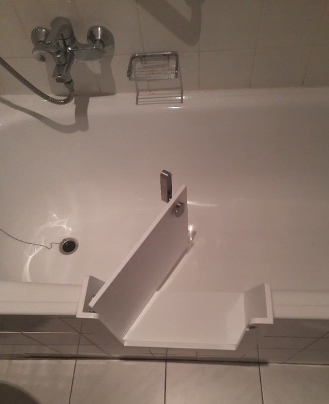 Další činností je vyřezání otvoru do vany (obr. 7). Po začistění otvoru se provede výplň vzniklých dutin nenasákavým polystyrenem (obr. 8) a utěsnění všech vzniklých spár. Poslední etapou je vsazení dvířek a utěsnění spáry. Po ukončení montáže uklidí a odnese firma všechny odpadní materiály. Celková doba montáže je asi 4 hodiny. Výsledná podoba zásahu je vidět na obr. 9. Po 24 hodinách je možno využít vanu pro koupel (obr. 10). Podle původního osazení vany vznikne různě vysoký schodek mezi dnem vany a podlahou koupelny. Při zvýšené poloze vany je možno používat odnímatelný plastový schodek. Výsledným řešením je snadný přístup do vany pro osoby s omezenou pohyblivostí. Pro bezpečnější pohyb během koupele je ke stěně připevněno madlo.