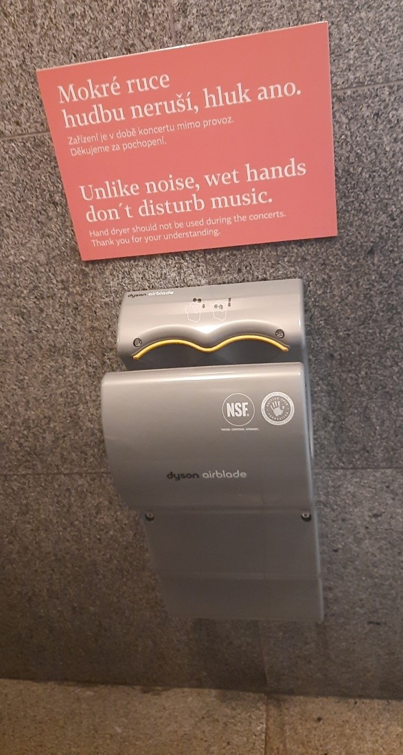 Posledním bodem, na který bych chtěl upozornit, je otázka sušení rukou ve veřejných prostorech. Kovidová krize vyvolala diskuze na téma šíření hygienických problémů vzduchem. Během krize se ozývalo ze všech stran, že není vhodné osazovat pro osušení rukou na hygienických místnostech rozháněče mikroorganizmů teplým vzduchem z těchto sušáků. Vím, že osazení těchto hluk produkujících přístrojů nenavrhují pracovníci ZTI. Příkladem velmi nevhodného použití jsou sušiče na hygienických místnostech v pražském Rudolfinu (obr. 11). Prosím, upozorněte architekta a objednatele, který navrhuje interiéry, na nevhodnost řešení.