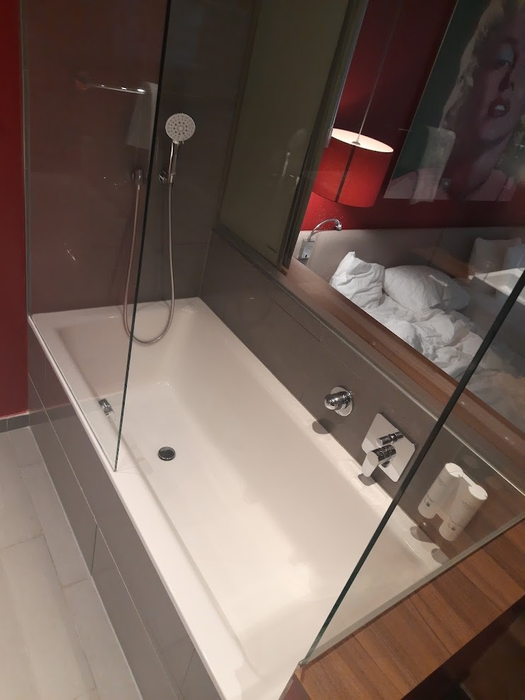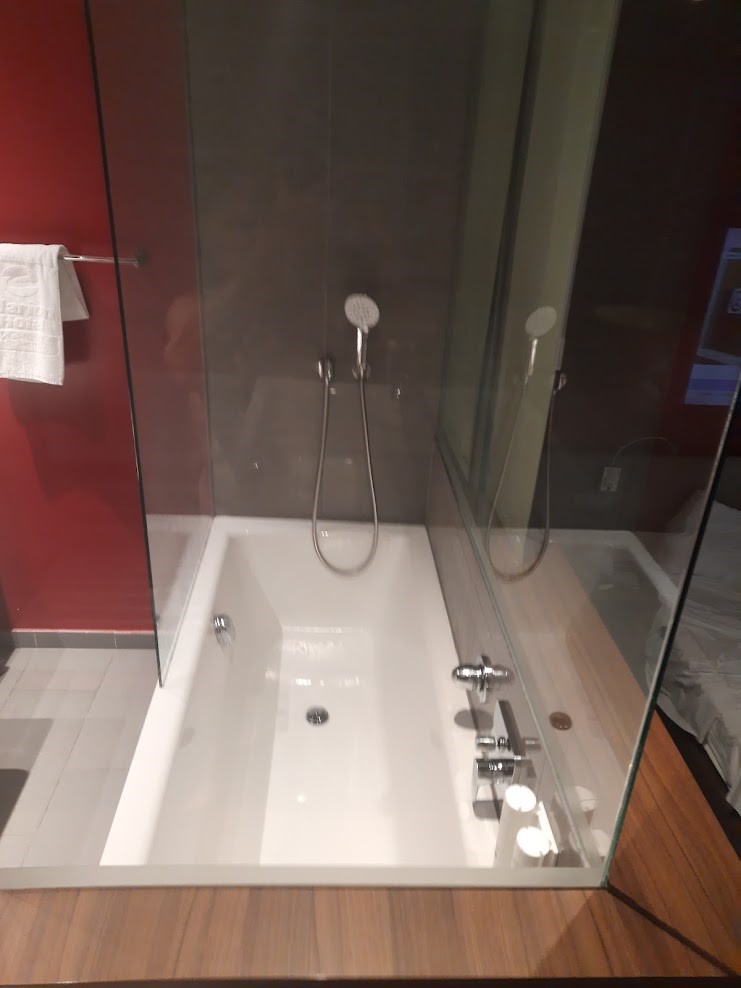 Příkladem skoro nebezpečného řešení hygienických místností může být koupelna u hotelového pokoje (obr. 3). Po přenocování v moderním hotelu jsem konečně pochopil to množství úrazů VIP osob po sprchování. Úžasný pohled z vany. umístěné ve „skleníku“, do sousedícího pokoje a obráceně z postele na koupající se partnerku (obr. 4). Problém nastává při vstupu do vany a výstupu z ní. Na obr. 3 jsou vidět skleněné stěny v místě vstupu do vany. I zdravý člověk se nemůže přichytit jinak než se mokrou rukou držet 5 mm silného skla, Přitom by stačilo přesunout skleněnou zástěnu a k pevné stěně na druhé straně vany přidat madlo na stěnu u vstupu do vany. Samozřejmě by se muselo přehodnotit umístění ovládacích armatur.