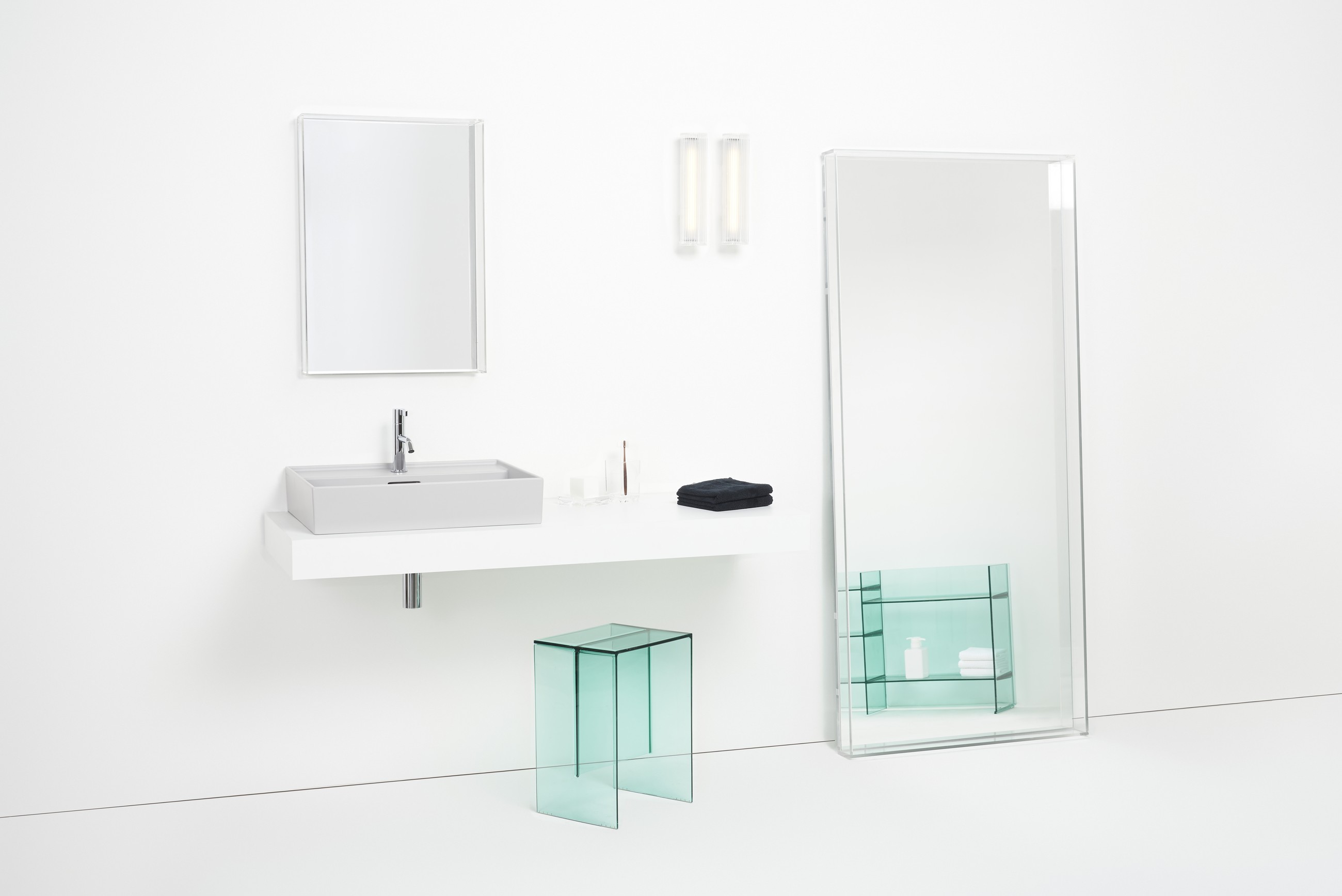 Minimalismus vyznává jednoduché linie, geometricky přesné tvary a absenci jakýchkoliv přebytečných prvků. Příkladem můžou být kolekce Kartell • LAUFEN nebo MEDA společnoti LAUFEN, které se řadí mezi nejpropracovanější koupelnové řady v minimalistickém stylu.