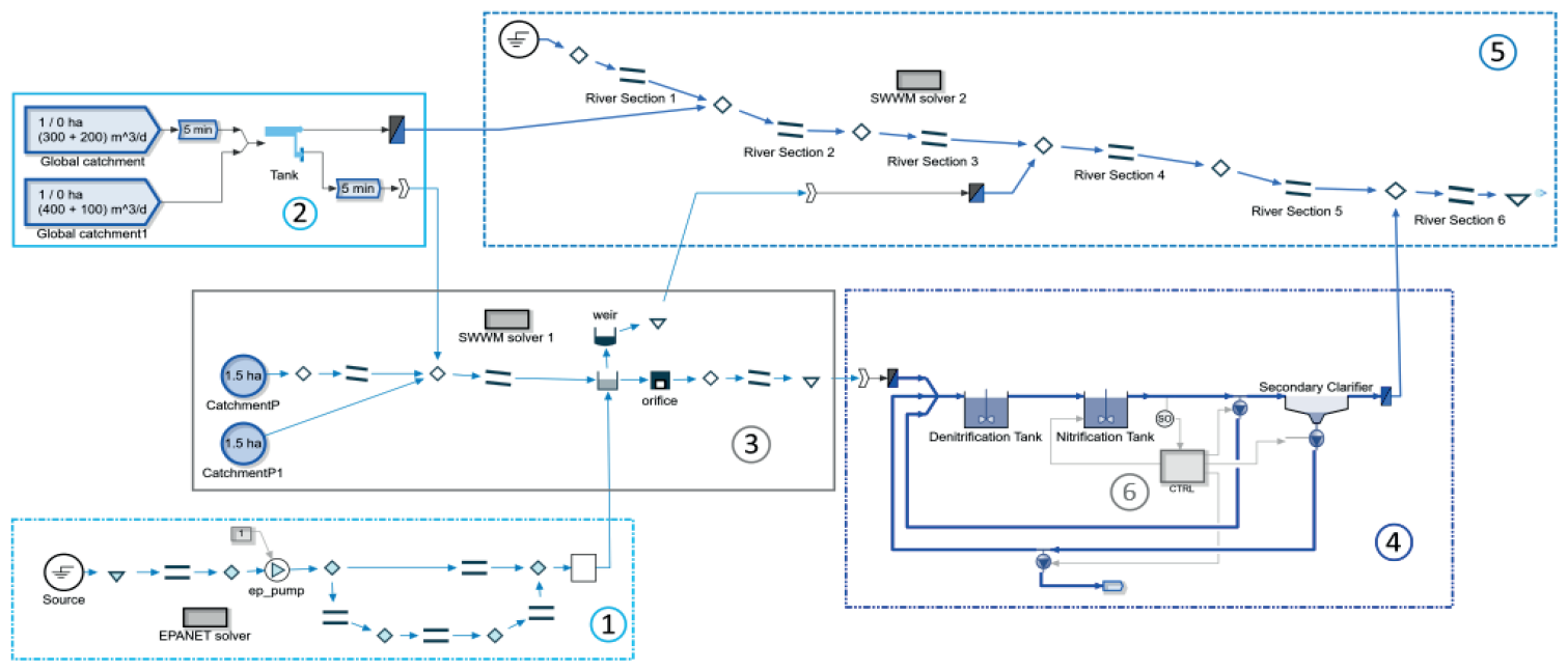Obr. 1: Příklad integrovaného modelu v SIMBA# s paralelní simulací subsystémů s příslušnými speciálními řešiči (tlaková vodovodní síť (1), povodí (2), kanalizační síť (3), čistírna odpadních vod (4), řeka (5), automatizační funkce (6))
