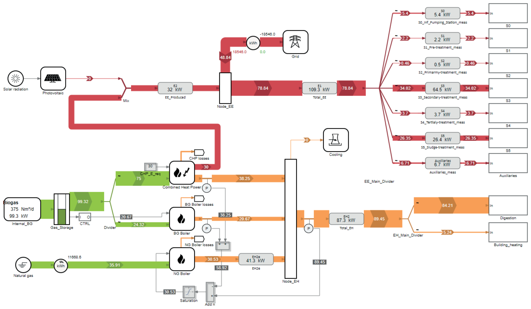 - Po verifikaci hydraulického a látkového modelu je na základě informací o energetických zařízeních, spotřebách a produkcích energie zpracován navazující energetický model (obr. 6).