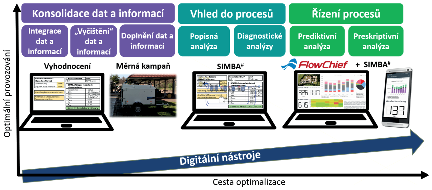 Software SIMBA# představuje univerzální simulační systém pro dynamické modelování technologií ve vodním hospodářství. Integruje potřebné detailní modely procesů i řídicích prvků. SIMBA# se v praxi využívá k navrhování i ke každodenní optimalizaci v rámci provozování (využití jako součást digitálních dvojčat ČOV), kdy model běží paralelně s reálnou čistírnou a pomáhá testovat zásahy či ladit řízení – viz obr. 2:
