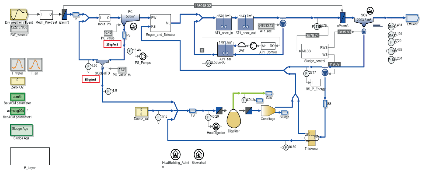- Výše popsaná simulace odhaluje místa s nejvyšší spotřebou energií. Verifikovaný komplexní hydraulický, látkový a energetický umožňuje pro potřeby návrhu opatření testovat možnosti úprav technologií ČOV tak, aby při plnění všech požadavků zvýšení energetické efektivity (např. využití kalu, vzniklého bioplynu) či porovnávat různé varianty technologií z hlediska energetické bilance.