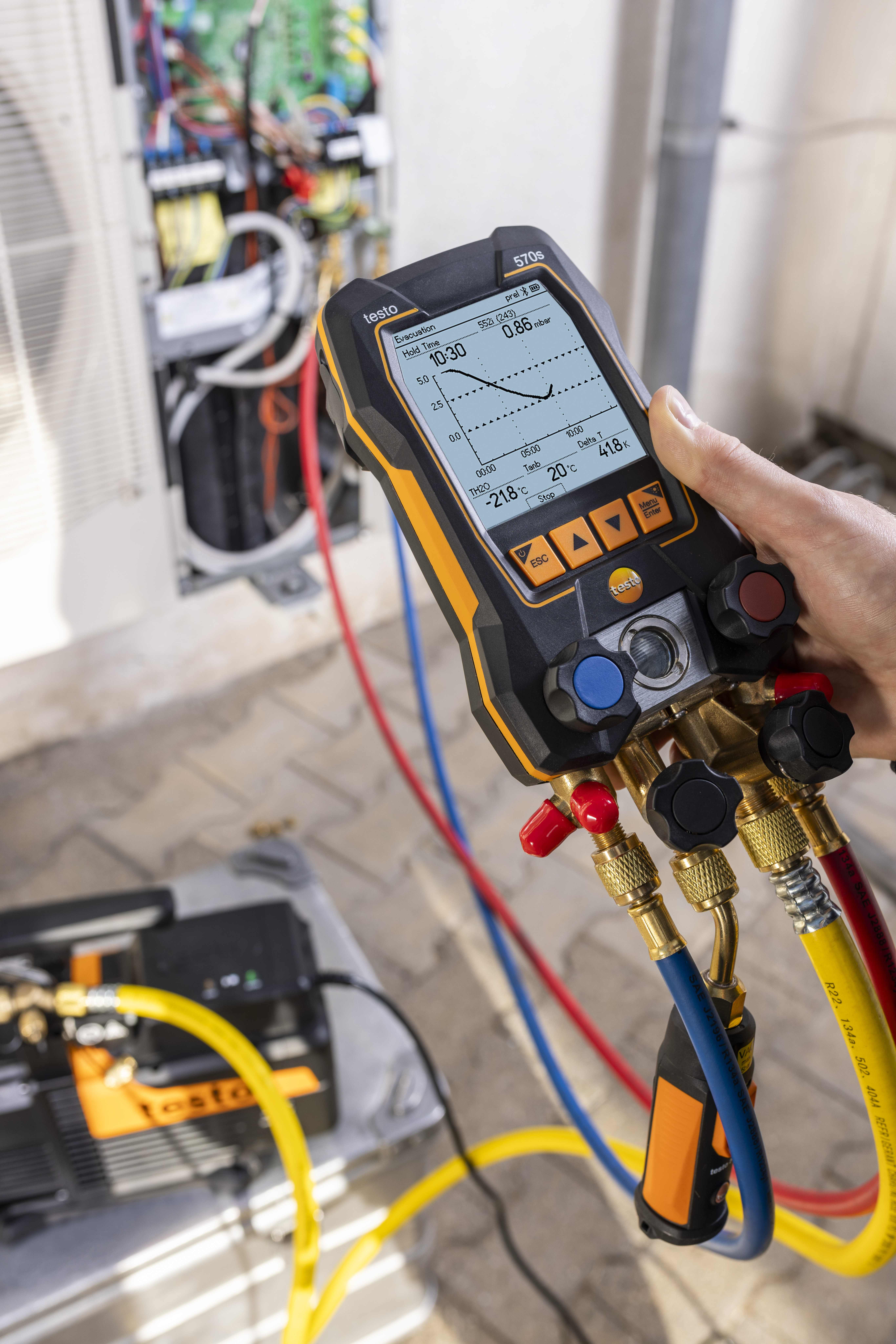 Pumpa pro vakuaci chladicích systémů testo provede vakuaci chladicích systémů a tepelných čerpadel plně automaticky. Chytrá technologie při dosažení cílové hodnoty vakuaci sama zastaví a poté automaticky spustí test udržování vakua. Pumpa je vhodná pro použití s hořlavými chladivy.