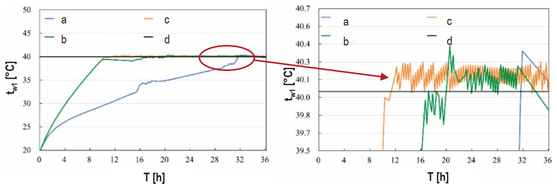 Naše nejdůležitější otázka stran tepelné odezvy systému může být zodpovězena obr. 1a (vlevo). Ten znázorňuje, jak dlouho trvá, než dosáhne nastavené (žádané) teploty přívodní vody do systému. Trvá 31,75 h, než teplota přívodní otopné vody dosáhne 40 °C tradičním způsobem řízení (PID regulátor), 18,38 h způsobem fuzzy řízení (fuzzy PID řízení) a pouze 11,25 h způsobem tzv. optimálního (teoreticky ideálního porovnávacího) řízení. PID regulátor byl nastaven podle doporučení Chiena, Hroncse a Reswicka (KP = 0,6 KP,krit , TI = Tn a TD = 0,12 Tkrit) a dále nebylo jeho chování optimalizováno. V porovnání s PID regulací zkrátila optimalizovaná fuzzy regulace dobu tepelné odezvy potřebnou k dosažení nastavené teploty přívodní vody o 64,6 %. Jak je znázorněno na obr. 1b (vpravo), fuzzy regulace je stabilnější a má rychlejší tepelnou odezvu než tradiční řídicí systémy. Při optimální regulaci je křivka přívodní teploty otopné vody hladší a kolísání je menší.