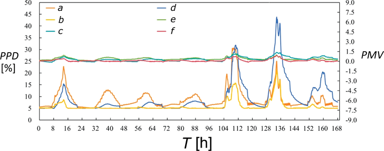 PPD – procentuální podíl nespokojených, PMV – předpověď středního tepelného pocitu, T – čas, a – PPD s PID řízením, b – PPD s optimálním řízením, c – PMV s fuzzy PID řízením, d – PPD s fuzzy PID řízením, e – PMV s PID řízením, f – PMV s optimálním řízením