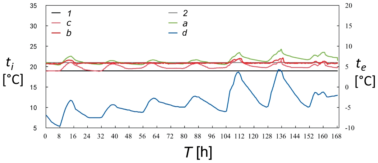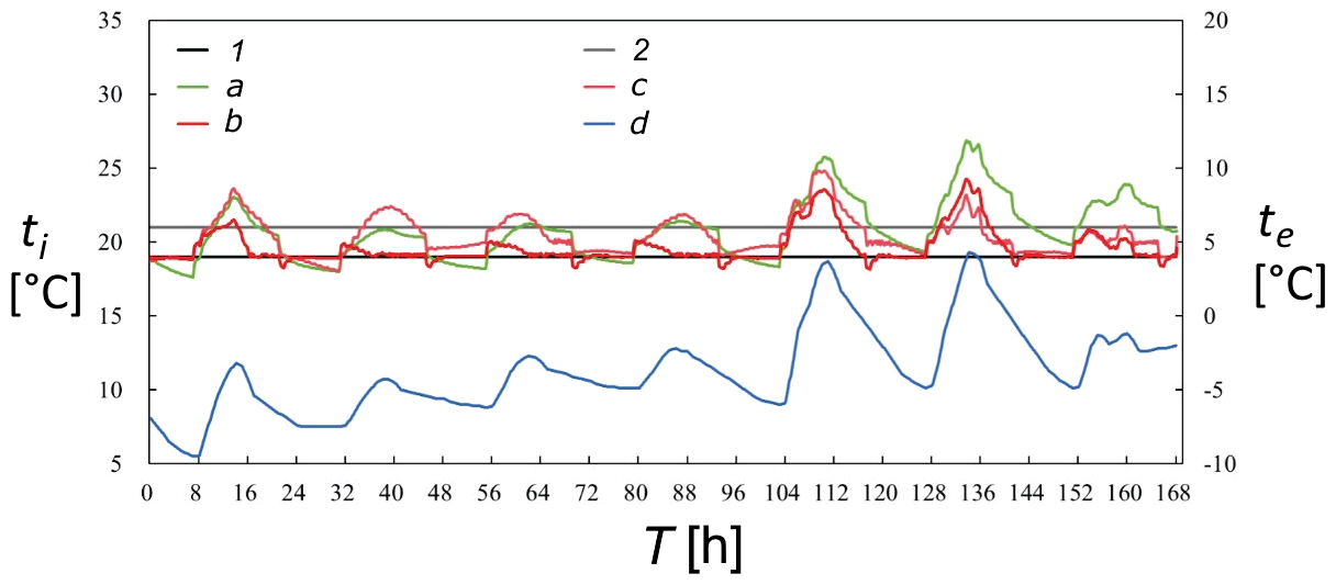 ![Obr. 3 Teplota vnitřního vzduchu pod různými strategiemi řízení, (b) kancelář s otevřeným uspořádáním [2]. ti – teplota vnitřního vzduchu, te – teplota venkovního vzduchu, T – čas, 1 – spodní hodnota, 2 – horní hodnota, a – PID řízení, b – optimální řízení, c – fuzzy PID řízení, d – průběh venkovní teploty](/docu/clanky/0294/029404o8.png)