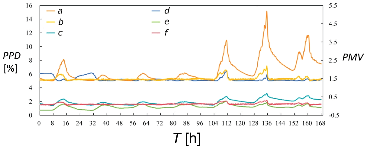 ![Obr. 4 Vnitřní tepelná pohoda pod různými strategiemi řízení, (a) severní kancelář [2]. PPD – procentuální podíl nespokojených, PMV – předpověď středního tepelného pocitu, T – čas, a – PPD s PID řízením, b – PPD s optimálním řízením, c – PMV s fuzzy PID řízením, d – PPD s fuzzy PID řízením, e – PMV s PID řízením, f – PMV s optimálním řízením](/docu/clanky/0294/029404o10.png)