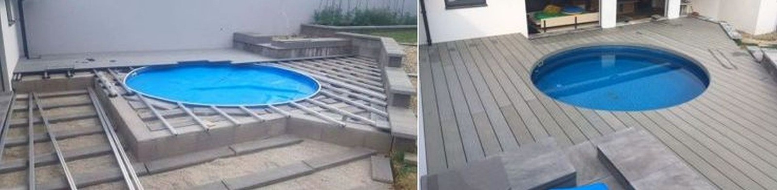 Instalaci terasy provedl slovenský partner výrobce prken, společnost FORSTA, který potvrdil svoji vysokou kvalitu práce špičkově zvládnutými detaily. Počínaje dokonale vykrouženou obrubou bazénu z kompozitní lišty Terafest® přes na milimetr uložená a vyspádovaná prkna až po precizní linie vyvýšených částí terasy, které opticky zajímavě korespondují se stupňovitou obvodovou zdí kolem pozemku.