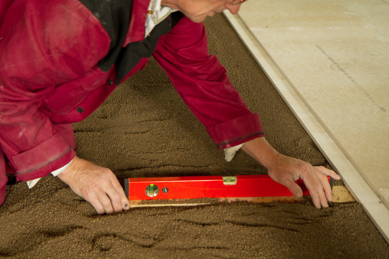 - Urovnání a hutnění: Liapor se urovnává a hutní ručně, pomocí hliníkových stahovacích latí, hladítek a vodováhy. Správné zhutnění se kontroluje tak, že se na vrstvu kameniva položí odřezek podlahové desky o velikosti přibližně 50 × 50 cm. Pokud si na desku stoupne statný dospělý člověk, deska by se neměla pod ním hýbat.