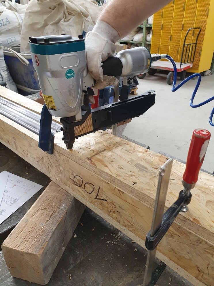 Obr. 7: Fotografie z výroby vzorků – upevnění OSB ochrany pomocí pneumatické sponkovačky