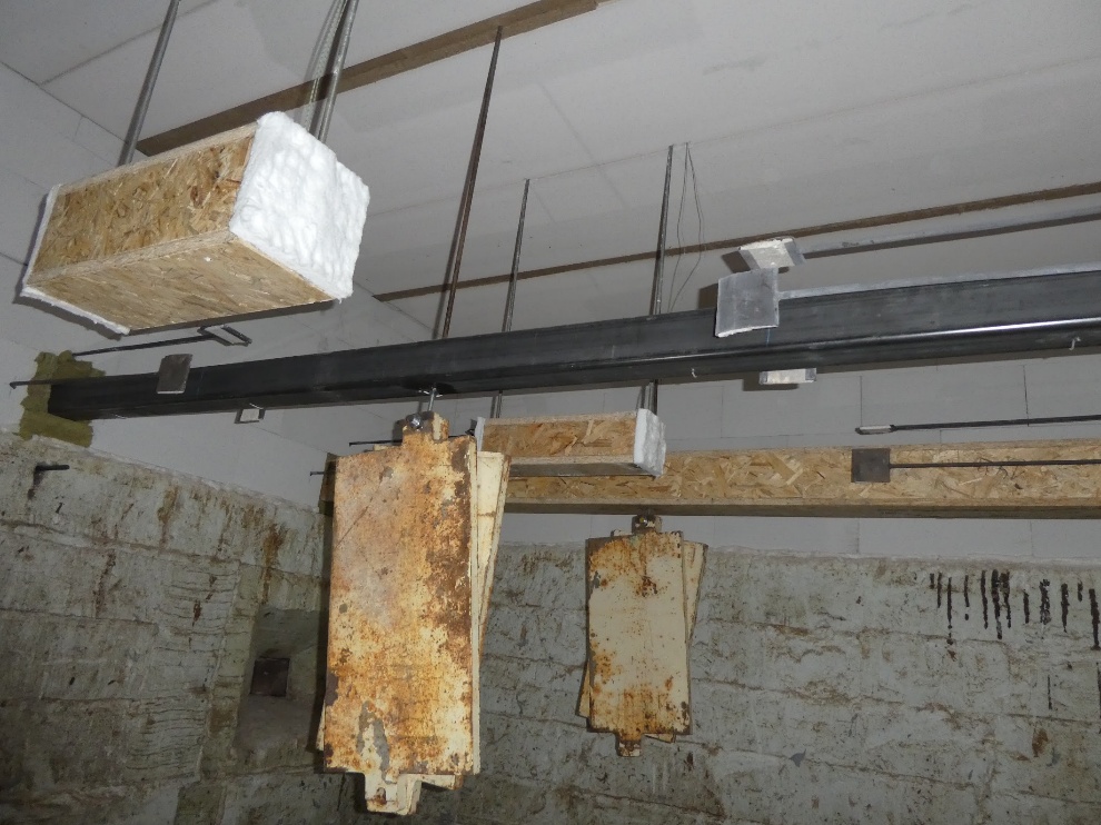 Zkouška byla provedena v horizontální peci (Obr. 1 a Obr. 17), kde byly vystaveny požáru tři ocelové nosníky (SHS 100/6, délka 3700 mm):