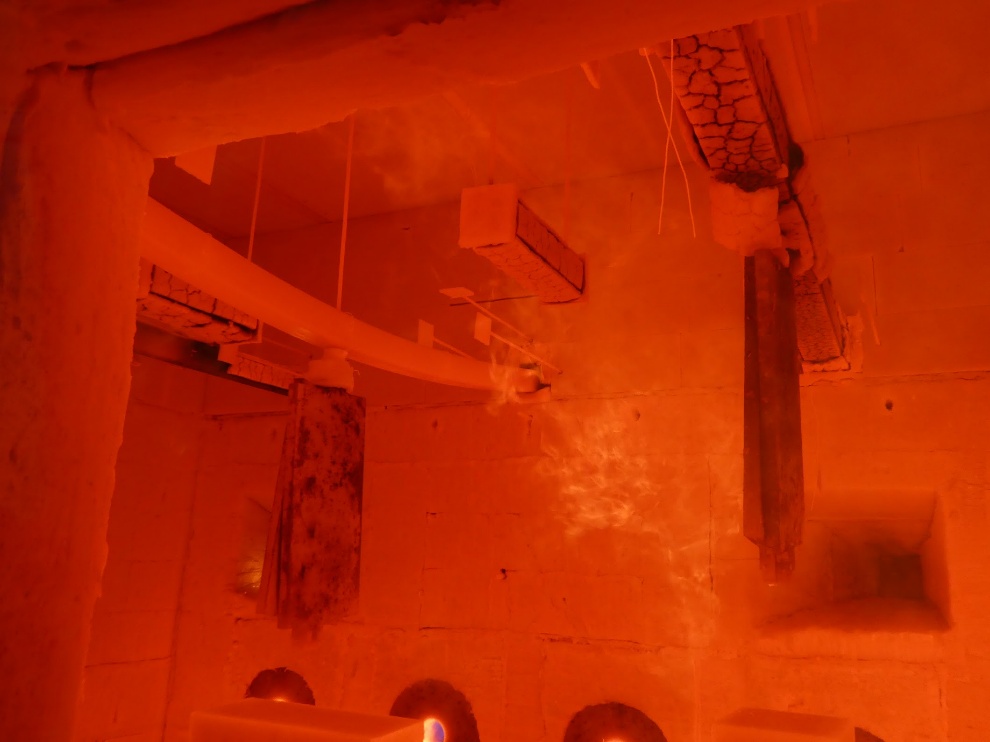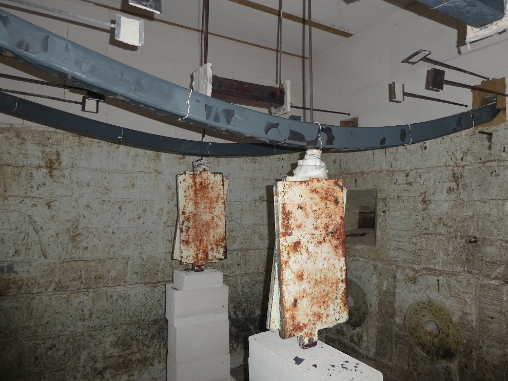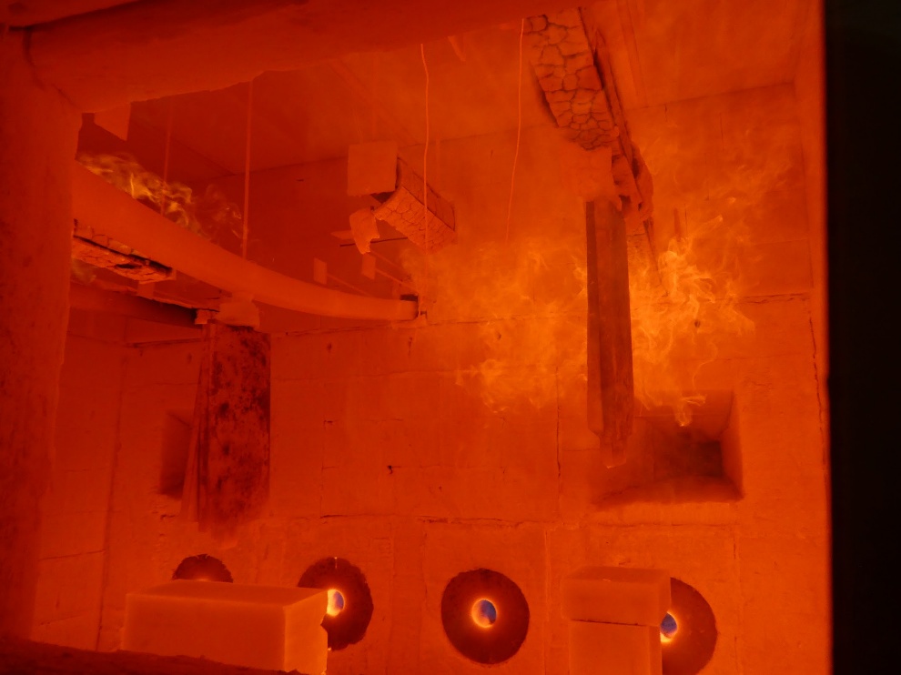 Pec měla vnitřní rozměry 4,0 × 3,0 m a výšku zvýšenou z 2,35 m na 3,25 m. Nosníky byly uloženy na rám ve výšce 2,25 m a ohřívány ze všech čtyř stran osmi plynovými hořáky o výkonu až 2560 kW (viz Obr. 2 a Obr. 3). Schéma provedených obkladů je na Obr. 4. Fotografie z výroby vzorků a požární zkoušky jsou na Obr. 5 až Obr. 13.