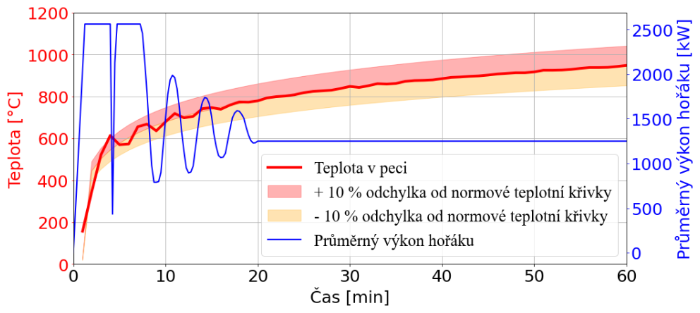Během experimentu byl výkon hořáků řízen tak, aby sledoval křivku ISO 834. Po 6 minutách začala oscilace výkonu, fixace nastala po dosažení 800 °C ve 20. minutě (Obr. 14). Naměřené hodnoty uvedené na Obr. 15. a 16 byly v následující části využity pro validaci numerických modelů a porovnání vývoje teploty a deformací s výsledky simulací.