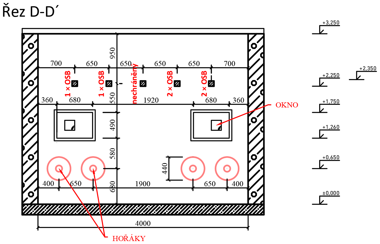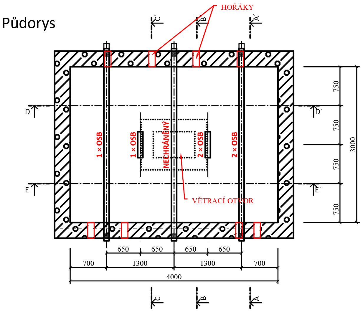 Umístění zkoušených nosníků v peci je znázorněno na Obr. 2 a Obr. 3. Na půdorysu pece (Obr. 2) je patrné rozložení jednotlivých vzorků, rozmístění hořáků a větracích otvorů, které zajišťovaly rovnoměrné působení tepelného toku na zkušební tělesa. Řez D–D (Obr. 3) pak ukazuje svislé uspořádání, kde jsou patrné varianty nosníků chráněných jednou či dvěma vrstvami OSB a porovnávací nechráněný prvek. Současně je zde vyznačena pozice hořáků i otvorů simulujících okna pro odvod horkých plynů.