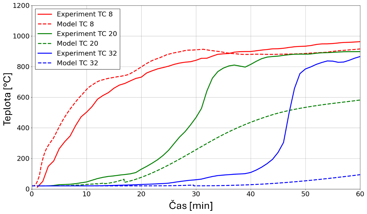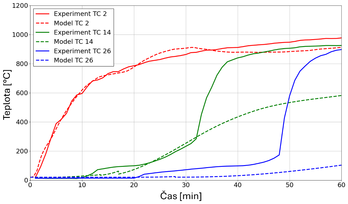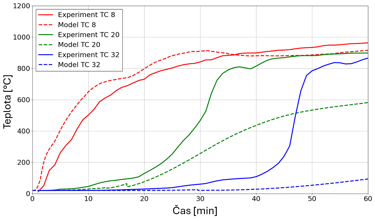 CFD model požární zkoušky, založený na experimentálně ověřených vstupních parametrech a geometrii pece, umožnil detailní simulaci přestupu tepla z plynu na konstrukci, včetně interakce s tepelně degradujícím OSB obložením. Model věrně zachytil trend ohřevu u nechráněných prvků a do doby integrity obkladu vykazoval velmi dobrou shodu i u chráněných profilů. Odchylky nastaly až po odpadnutí obkladu, které model zatím nezohledňoval. Tento fakt podtrhuje potřebu budoucího rozšíření modelu o mechanické selhání obkladu.