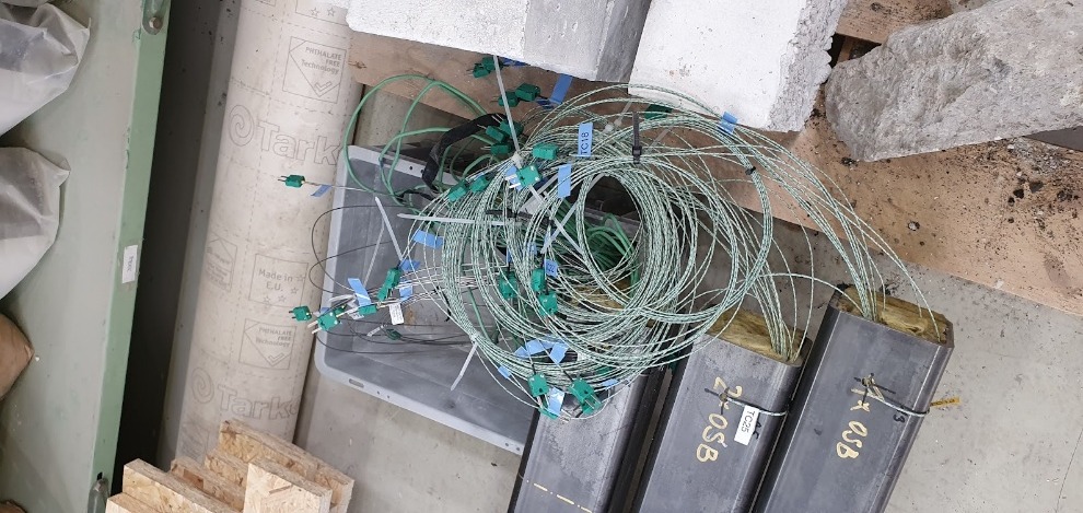 Termočlánky typu K byly umístěny na všech čtyřech stěnách nosníků. Připevnění bylo realizováno metodou „přítlačného hrotu“ do předvrtané jamky, následně přitlačeno obkladem. U nechráněného profilu byly použity termočlánky o průměru 2 mm (rozsah do 1150 °C), u chráněných profilů jemnější s keramickým povlakem (0,5 mm, do 600 °C). V dutině nosníků byl veden termočlánek v minerální vlně, aby se minimalizovalo ovlivnění naměřených hodnot.