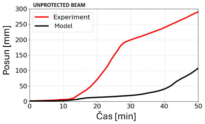Výsledky ukázaly, že po dosažení teploty přibližně 600 °C dochází k prudké změně mechanického chování oceli, což se projevuje výrazným nárůstem průhybů (Obr. 6). Tento jev je v souladu se známým fyzikálním mechanismem poklesu modulu pružnosti a meze kluzu oceli při vysokých teplotách. Porovnání s experimentem však odhalilo, že průhyby vypočtené na základě Eurokódu 3 byly systematicky nižší než hodnoty naměřené, a to zejména v pozdější fázi zkoušky. Tento rozdíl je možné vysvětlit absencí viskoplastického přetváření oceli, které má při teplotách nad 500–550 °C zásadní vliv na deformace konstrukce.