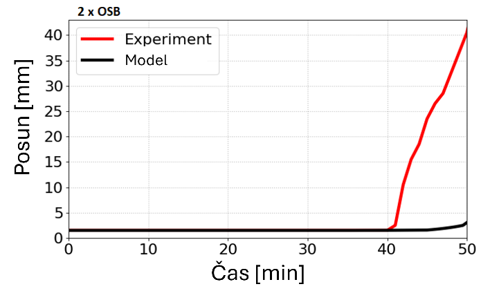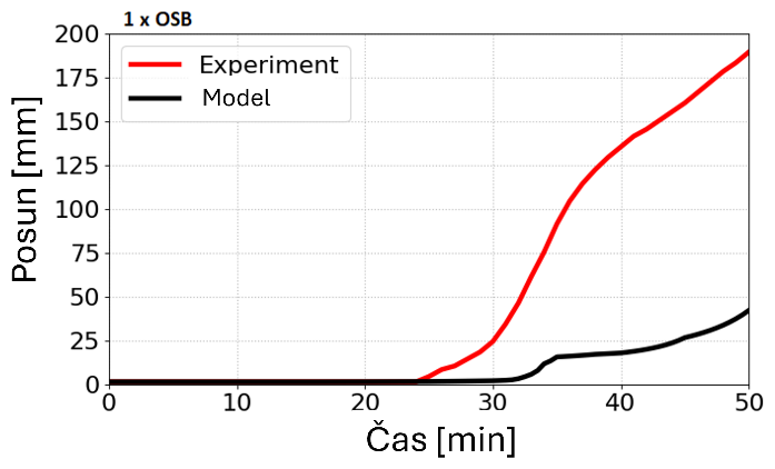 Numerické simulace rovněž ukázaly, že nerovnoměrný ohřev nosníku po jeho délce měl v konkrétních podmínkách experimentu jen omezený vliv na výsledný průhyb, což je důležité pro zjednodušené modely. Naopak lokální selhání OSB obkladu, zaznamenané při experimentu, vedlo k prudkému zvýšení teploty oceli v odhalené části a následně k rychlému nárůstu deformace, což model bez explicitní simulace poruchy obkladu nedokázal plně zachytit.