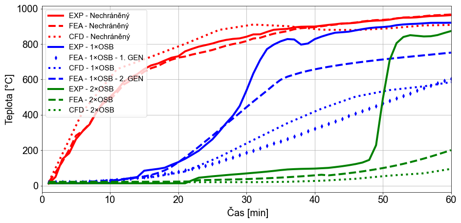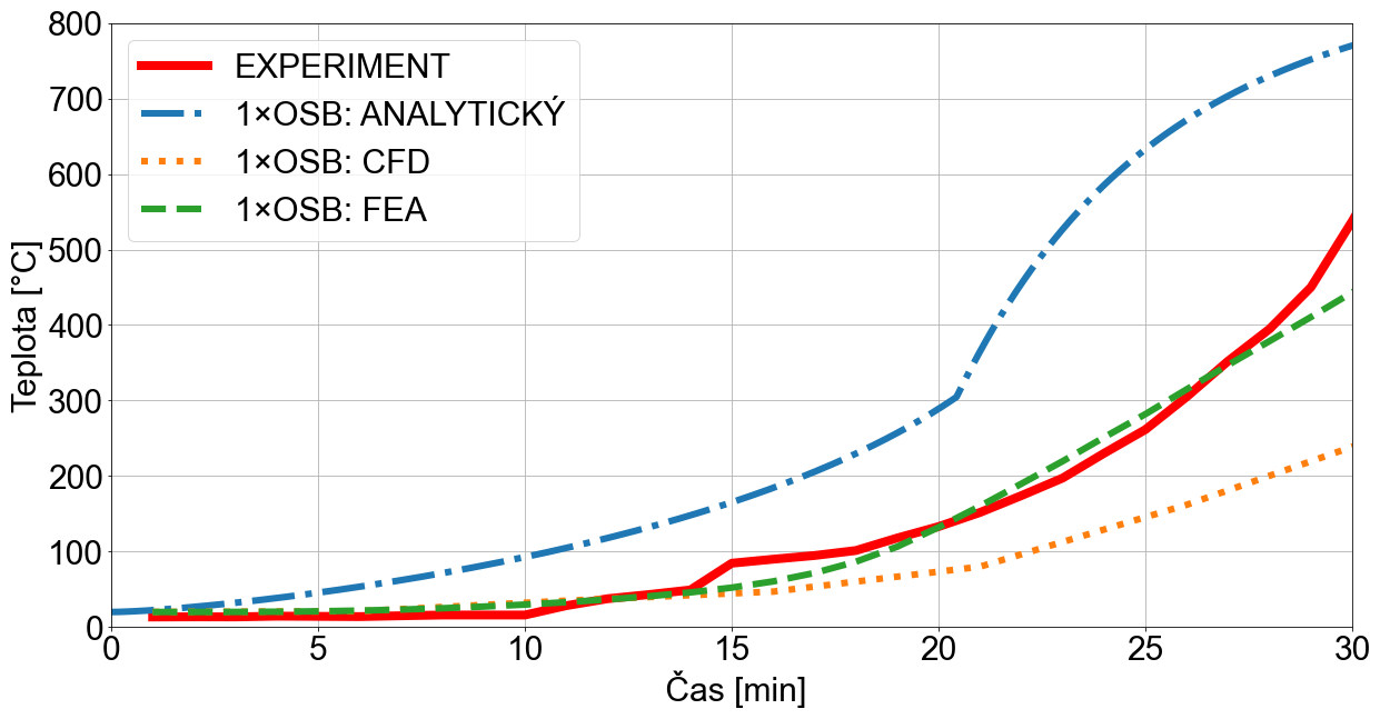 Výsledky ukázaly dva charakteristické jevy. První z nich odpovídal době plné funkčnosti OSB obkladu, kdy se rozdíl mezi modelem 2. gen. a experimentem pohyboval kolem 80 °C. Tento rozdíl lze vysvětlit použitím standardních materiálových charakteristik OSB, zejména hodnot tepelné kapacity, která má v této fázi významný vliv na rychlost ohřevu. Porovnání s CFD modelem, v němž byla zahrnuta tepelná degradace OSB a tím i teplotně zá-vislý pokles hustoty materiálu, ukázalo, že právě vývoj hustoty OSB v závislosti na teplotě je nutné v budoucím výzkumu podrobněji řešit.