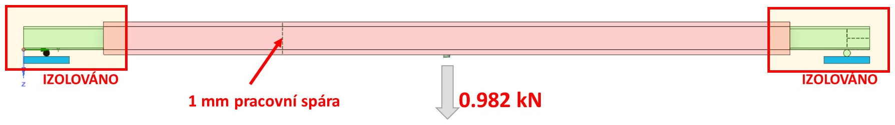 Geometrie modelu odpovídala prostému nosníku délky 3500 mm, zatíženému uprostřed rozpětí silou 982 N (Obr. 5). Tomu odpovídal maximální ohybový moment přibližně 0,86 kNm. U profilu SHS 100×6 tak vzniklo maximální napětí asi 12,9 MPa, což představuje přibližně 5,5 % meze kluzu oceli třídy S235. Tento statický model byl zvolen tak, aby co nejvěrněji odpovídal podmínkám velkorozměrového experimentu, kdy byly nosníky uloženy prostě na dvou podporách vytvořených pomocí volného a pevného válečku a zatíženy bodovým břemenem, reprezentujícím skutečné provozní zatížení. Tím byla zajištěna přímočará interpretace naměřených průhybů a jejich následné porovnání s výsledky výpočtů.