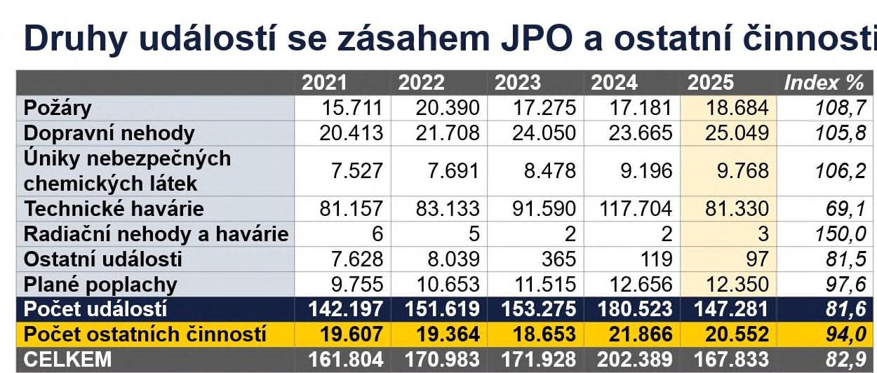 Generální ředitel HZS ČR Vladimír Vlček na bilanční konferenci shrnul činnost sboru v roce 2025 a nabídl k prostudování vypracované analýzy a grafy [3]. Z nich vyplývá, že jednotky požární ochrany v uplynulém roce zasahovaly u 167 823 událostí, což je podle statistik nejméně od roku 2021. Zároveň se ale během roku 2025 podílely na řešení několika neobvyklých nebo nezvykle rozsáhlých či tragických zásahů, které dále odstartovaly celorepublikové kontrolní akce a konzultace se ČKAIT v oblasti požární bezpečnosti staveb.