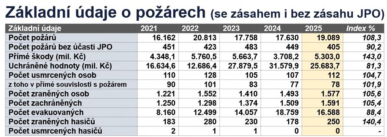 V oblasti požárů byl zaznamenán zvýšený počet zejména u požárů lesních porostů, volných a skladovacích ploch a u požárů odpadních produktů a skládek. Přímé škody způsobené požáry meziročně vzrostly, a to i v důsledku několika mimořádně rozsáhlých průmyslových požárů,“ uvedl na konferenci Vladimír Vlček a ukázal bilanční tabulku.