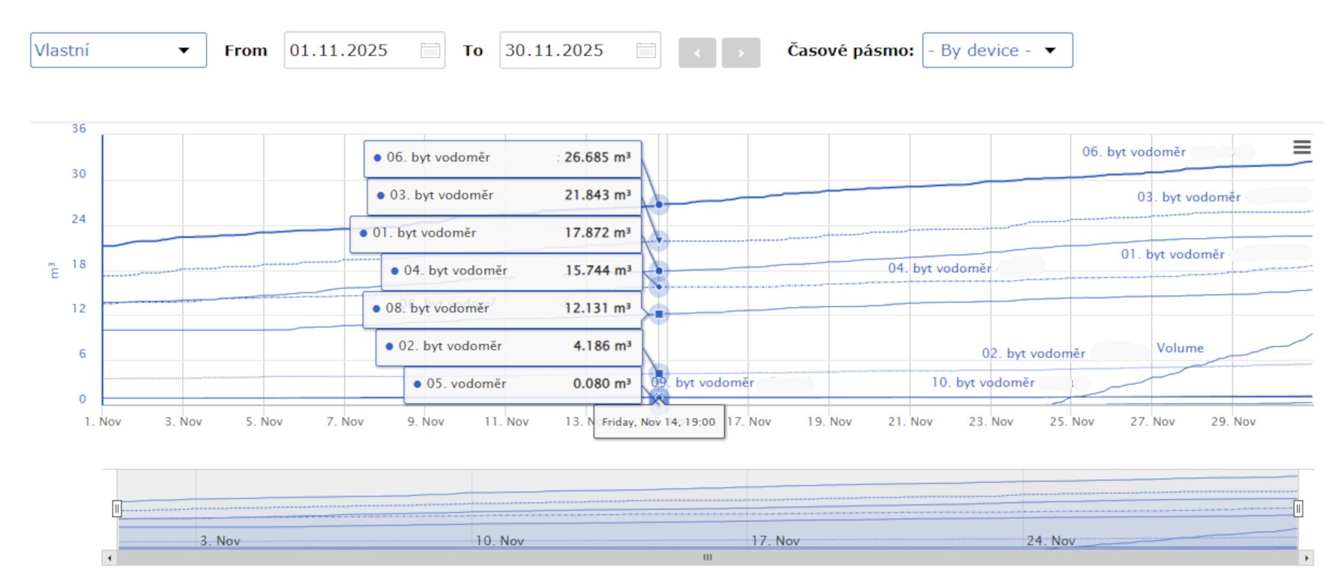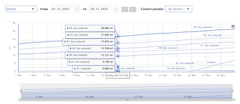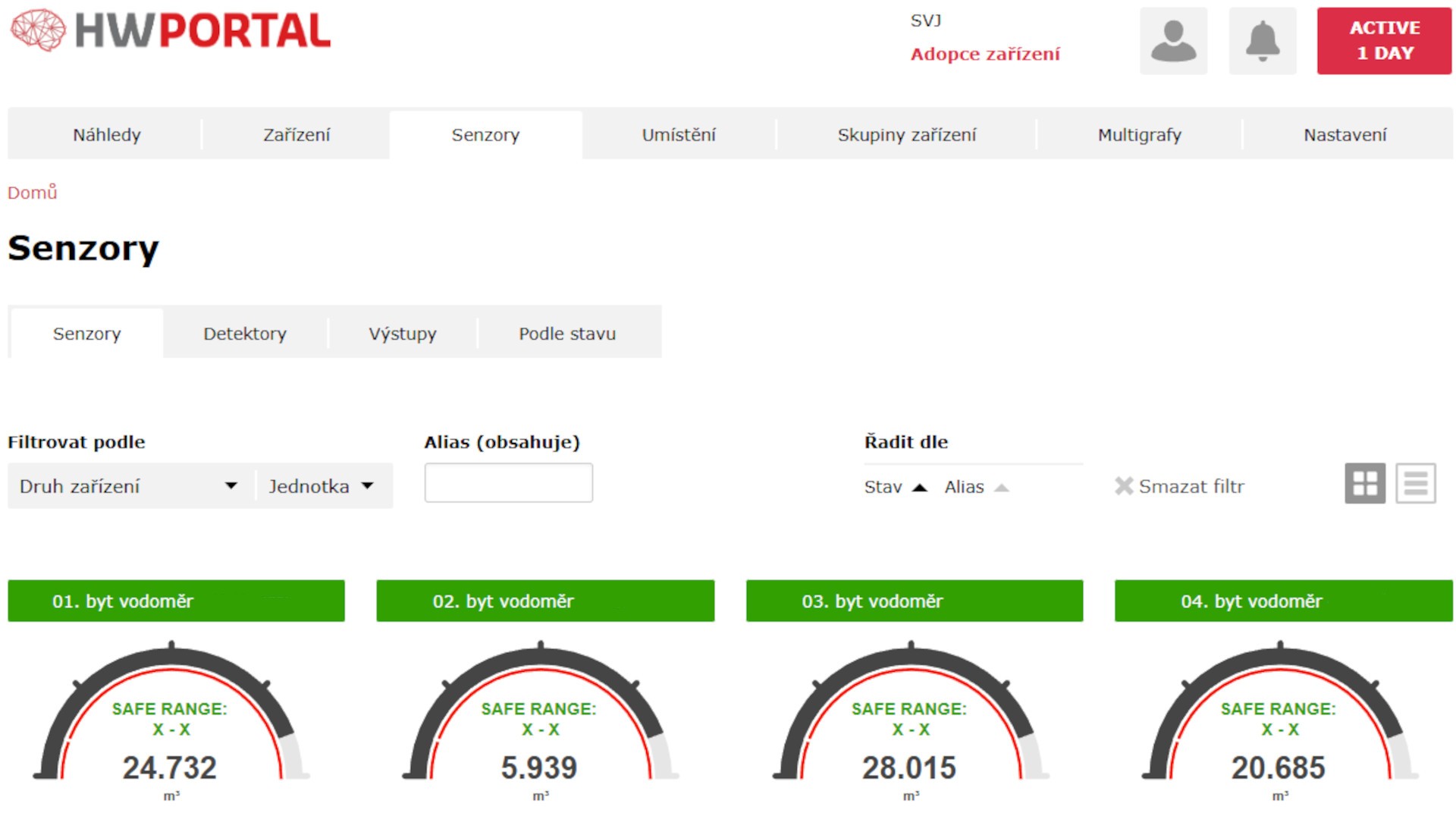 Správa dat probíhá v systému HWPortal.cz. Zodpovědná osoba má přístup ke všem měřidlům v objektu, může sledovat jejich historii a jednoduše exportovat hodnoty pro roční rozúčtování. Uživatel bytu vidí pouze svůj vlastní vodoměr, a to jak v prohlížeči, tak v mobilní aplikaci HWg Monitor. Data jsou do cloudu odesílána každých 15 minut, což umožňuje přehled v reálném čase. Systém také podporuje nastavení alarmů, například při náhlém zvýšení spotřeby nebo neobvyklém odběru během doby, kdy má být byt prázdný. Tím lze včas odhalit únik vody nebo poruchu zařízení.