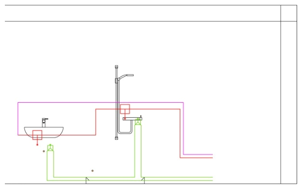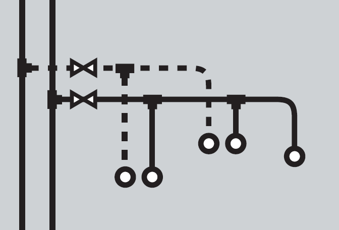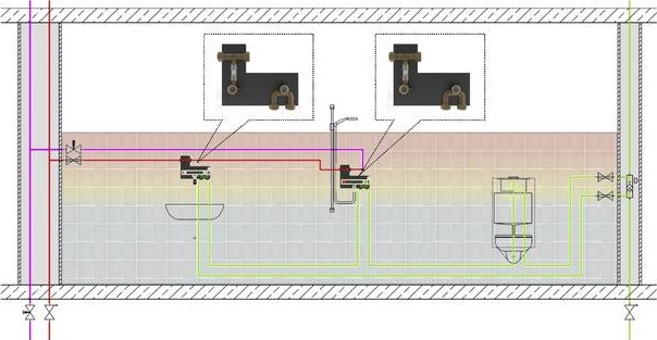 Obr. 8 Príklad optimalizácie pripojenia studenej vody a teplej vody s cirkuláciou pre nástennú armatúru: studená voda s prietokovou dvojitou nástenkou, teplá voda ako krátka odbočka [9]