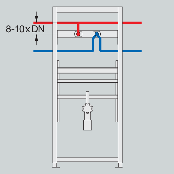 Meracie experimentálne štúdie ukazujú, že chladiace úseky s dĺžkou 8–10 × DN môžu zabrániť kritickému prenosu tepla cez armatúru do studenej pitnej vody a tým sa pri riadnej prevádzke systému zníži alebo do značnej miery odstráni opísané hygienické riziko, Obr. 7, 8. Pri systémovom riešení potrubia vodovodu a kotvenia armatúr do steny alebo predstenovej konštrukcie sú v súčasnosti na trhu aj prefabrikované hygienické boxy pre pripojenie studenej a teplej vody v zmysle hygienických požiadaviek, Obr. 9, 10. Studená voda sa privádza do dvojitej nástenky sériovým pripojením zdola, teplá voda cirkuluje v hornej časti hygienického boxu, pripojená cez jednoduchú odbočku. Potrubia studenej a cirkulujúcej teplej vody vedieme podľa možnosti v čo najväčšej vzdialenosti od seba, napr. studenú vodu nad podlahou v blízkosti kanalizácie a teplú vodu vyššie nad výtokovými armatúrami, Obr. 9c. Pri takomto riešení a pravidelnom odbere vody bez stagnácie môžeme zaručiť, že studená voda bude studená a teplá ostane teplou.