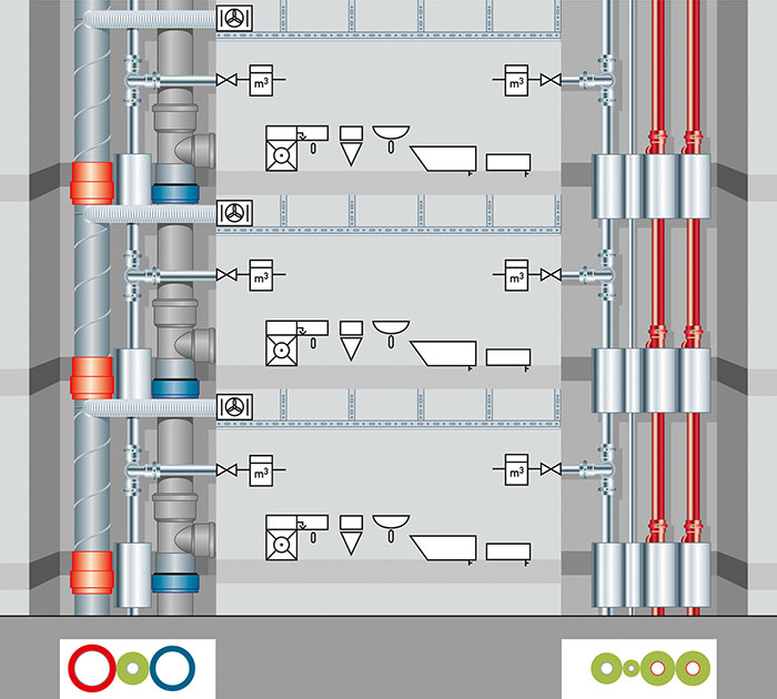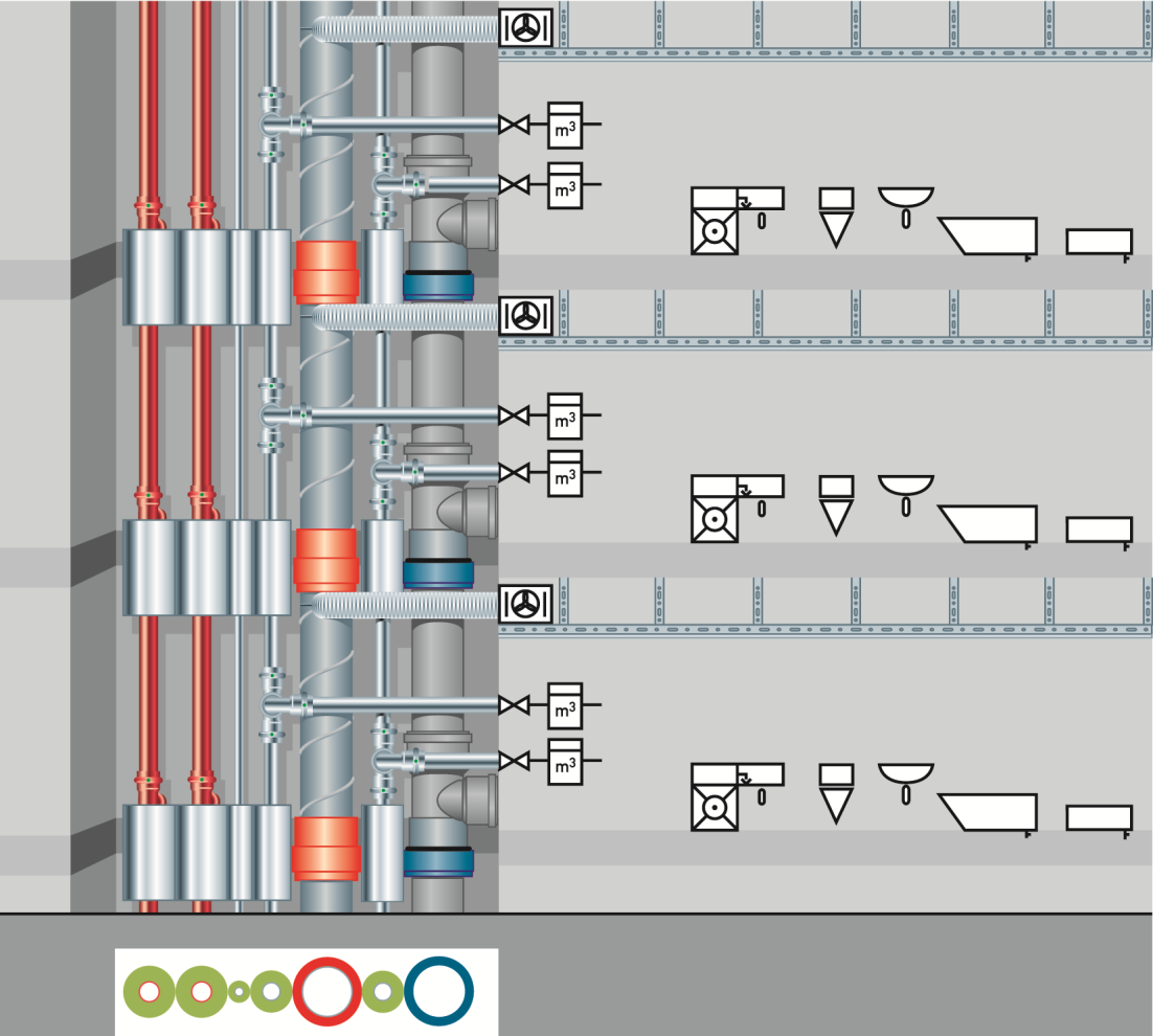 Obr. 14 Optimalizovaný stav: samostatné šachty (teplá/studená voda) chránené pred prenosom tepla a / alebo zvýšením teploty nad kritickú hranicu > 20/25 °C, ľavá šachta: odsávacie vetracie potrubie, studená pitná voda, odpadové kanalizačné potrubie; pravá šachta: potrubie TV a potrubie cirkulácie TV, prívodné a vratné potrubie vykurovania; izolácie potrubia podľa predpisov [7].