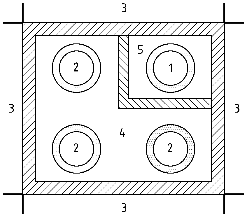 1 – potrubie pitnej vody, 2 – teplovodné potrubie, 3 – miestnosť, 4 – inštalačná šachta, 5 – oddelená „studená“ šachta [4]