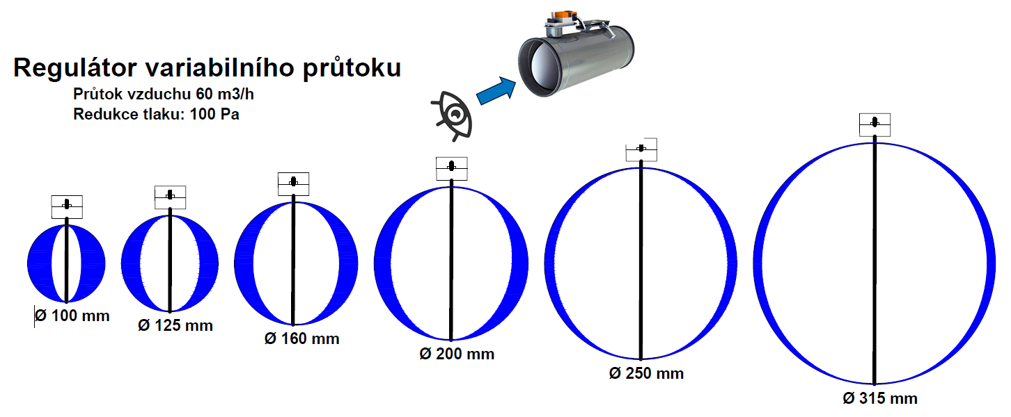 V místě regulační klapky vzniká vlivem škrcení vyšší rychlost vzduchu. Čím vyšší rychlost vzduchu, tím vyšší akustická odezva vzniká a úměrně stoupá také hodnota akustického výkonu Lw, která je v tomto případě charakterizována jako Vlastní hluk – IL_[dB(A)]. Vlastní hluk ovlivňuje také dimenzí regulátoru, tj. volbou zbytečně vyšší dimenze regulátoru z důvodu rezervy negativně ovlivňujeme akustický výkon ve zúžení volné plochy klapky, a zde vzniká typické pískání, což se projeví zvýšením akustického výkonu, viz Obr. 2.
