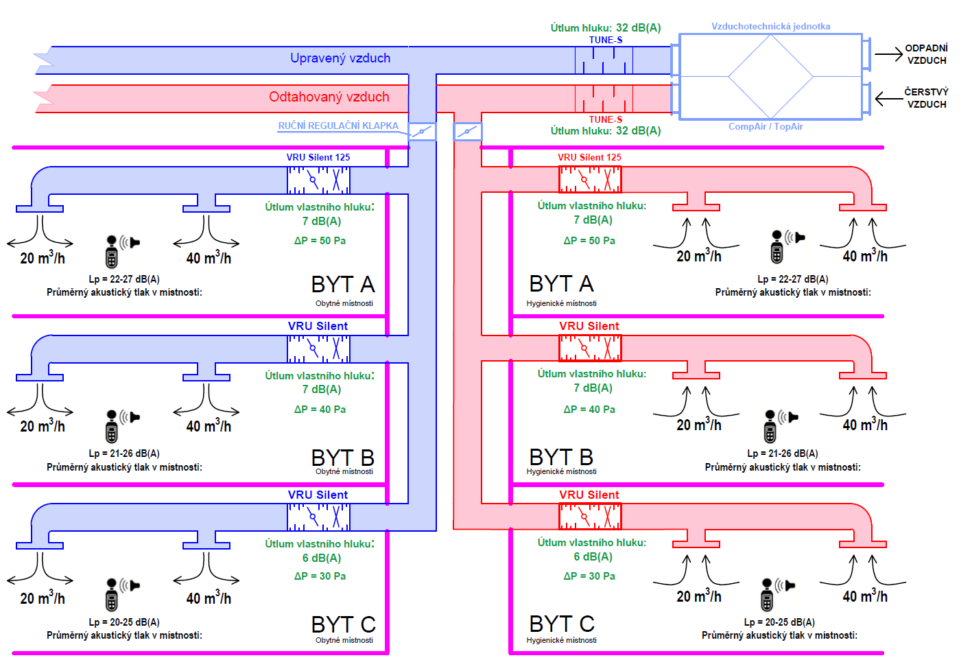 V jednotlivých bytech jsou na přívodu i na odvodu použity akustické variabilní regulátory VRU Silent v dimenzi Ø 125 mm, které regulují žádané množství vzduchu do bytu podle požadavku regulačního systému Pascal, nebo Simply Air. Z obrázku je patrné, že největší tlakovou diferenci, neboli redukci tlaku, musí zajistit nejbližší regulátor VRU Silent v bytě A, který je nejblíže vzduchotechnické jednotce. Akustický útlum regulátorů je v tomto případě průměrně 6–7 dB(A) a výsledný akustický tlak v bytě kolísá mezi 20–27 dB(A), což je bezpečná úroveň hluku pro splnění kritéria v obytných místnostech tj. 40 dB(A) během denních a 35 dB(A) během nočních hodin. Akustický tlak je splněn za předpokladu, že se potrubní rychlost vzduchu v bytových rozvodech bude pohybovat pod 4,5 m/s.