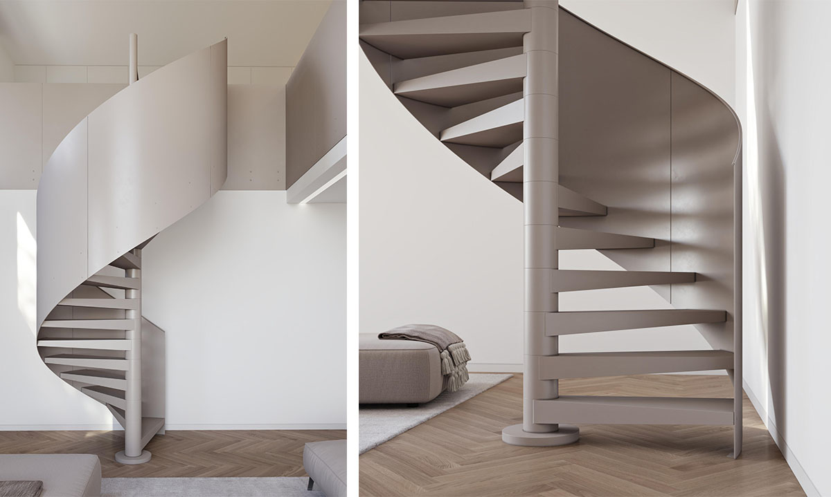 Schodiště CIRCLE, celokovové provedení s plným kovovým zábradlím, precizní svařovaná konstrukce bez viditelných spojů. Foto: JAP FUTURE