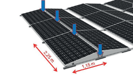 Celkové plošné zatížení tedy činí přibližně 180 kg/m2. Při zatěžovací ploše na střední patku, což odpovídá ploše jednoho panelu je to zhruba 464 kg přenášeným na jednu střední patku.