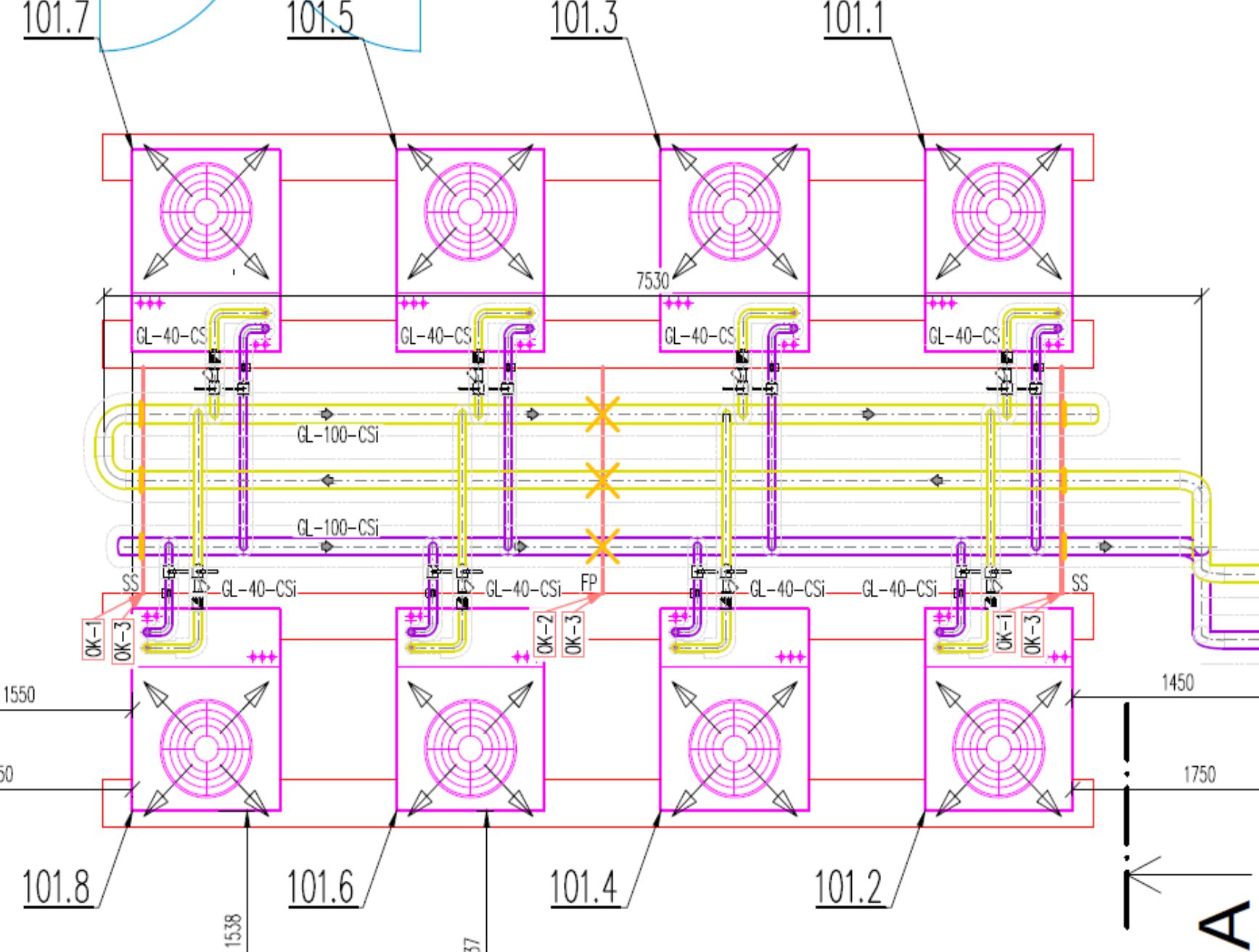 Obr. Tepelná čerpadla jsou instalována ve dvou řadách. Venkovní vzduch je nasáván z čela a pro průchodu tepelným čerpadlem vyfukován směrem vzhůru.